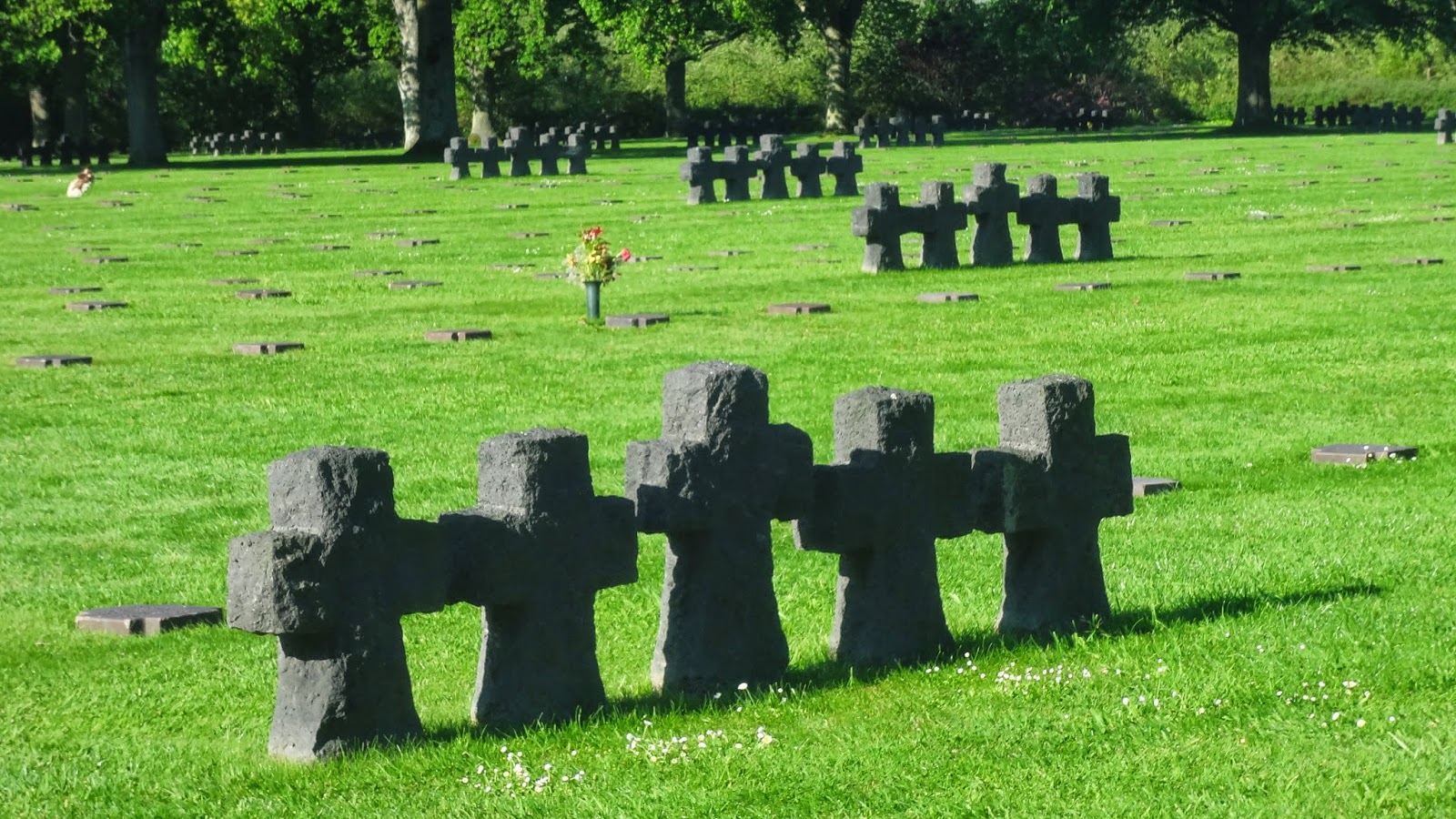First noticeable difference of German war graves and American are the shape and color of the crosses. I think the dark crosses just add to the melancholy of the field whereas the rows of white crosses at American cemeteries are somber but still heroic.