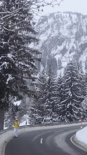 So Sunday rolled around and we journeyed two hours south to Oberjoch for my first go on skies ever. The ride to Oberjoch was one I had made several times in the summer but it was absolutely gorgeous with snow gracing the evergreens and mountains. The GPS claimed we were at our destination at the bottom of the mountain but we had to continue up the curvy roads to the resort. In The States, ski resorts are all inclusive where you can lodge, buy your lift tickets, and rent your gear all in one place. Not so in Germany. There’s a company that rents ski gear, then another company that owns lifts, and you have to find your own hotel and restaurant. We’d come one week too early for the season opening. No lessons were available at the ski school. There were no lifts, most of the runs were not open, but amazingly, the mountains were active and I was eager to add to the activity. Expectation Management
